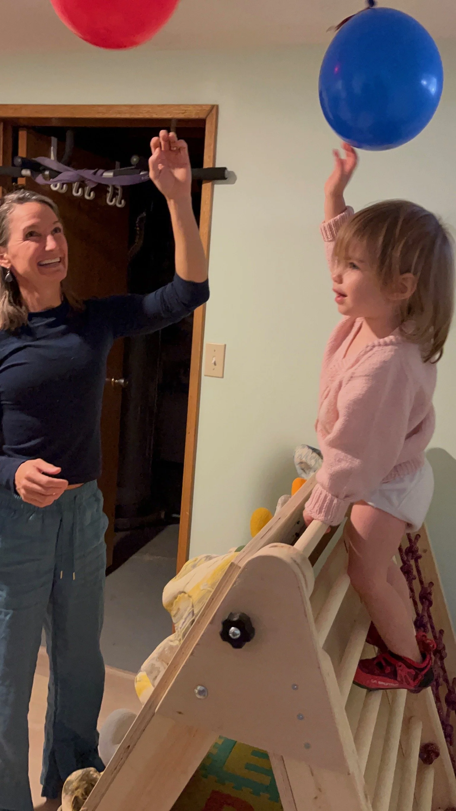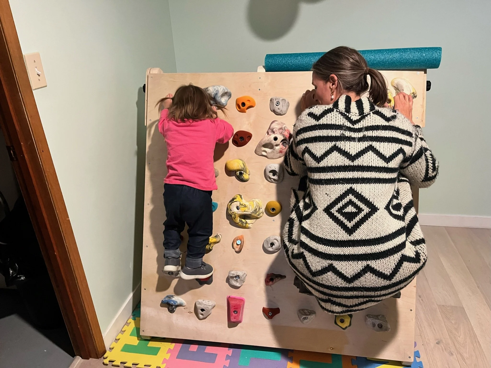 I made this wall for my daughter when she was a year old. We love it so much that I wanted to share it with you! It’s an A-frame design with a ladder and cargo net made from my old climbing rope on one side, and toddler spaced holds on the other side. The underside of the A-frame we turned into her fort/reading nook. The whole thing is collapsible for easy storage!