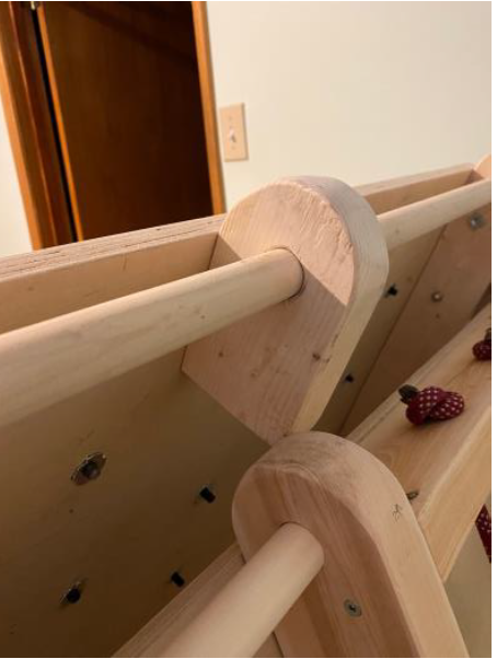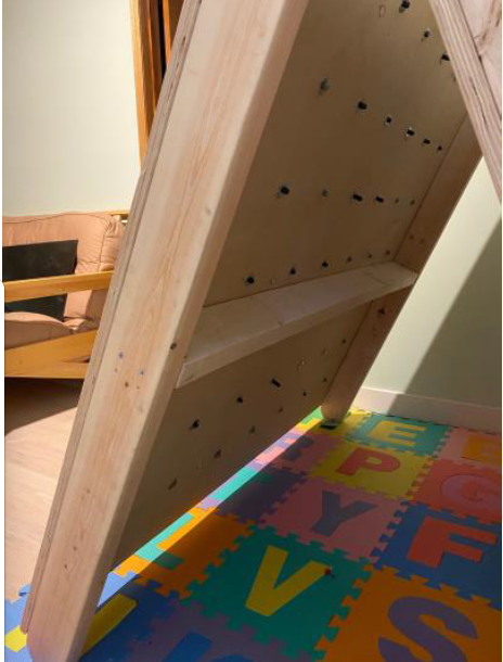 Hindsight, I wish I had started my bottom row 3” from the bottom and spaced it 6” apart above and to the side from there. This would have been more conducive to little legs and given me another row for holds at the top. I could have also put the cross bar in the center of the legs (at 25 ½”)